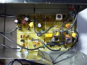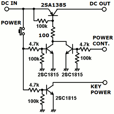 | プッシュSWで電源をON/OFFするためにこれも定番の電源制御回路を組み込みます。ACアダプターからの電源電圧が高いと電源部のトランジスターがかなり発熱しますので、DC6V出力くらいのACアダプターが最適かと。 | |