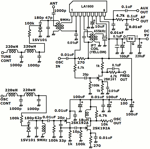 | 局発部分は5V駆動としましたが、LA1600への局発入力には10kΩの抵抗を通しています。最初は発振はするのですがうまく受信出来ず大変苦労しました。バリキャップへの電圧制御にノイズ成分が含まれると感度が低下します。LCフィルターを通してノイズをカットしています。気分的なことかもしれませんが市販の短波受信機と感度は匹敵すると思っています。中間周波数455kHzの下側ヘテロダイン方式です。受信周波数より455kHz低い周波数を発振します。VFO回路は世間一般で定番のLC+FETで構成します。周波数ドリフトは小さいと思います。しかしながら温度には敏感なようで、気温が低いと少し周波数を合わせるのに時間が掛かります。常時、周波数を追尾しますので受信の安定度には全く問題はありません。 | |