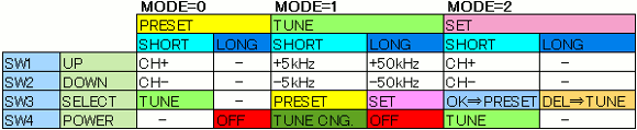 | 31mb受信機の操作に対してマニュアル選局を追加しています。選局モード(TUNE)でSW4を押すことでボリュームによるマニュアル選局とSW1/SW2による選局を切換えます。初期プリセットとしてCH00に6270kHzが設定されています。これはプリセットの設定、削除のソフト処理を簡略化するためのもので変更することは出来ません。同調の自動制御については正確にプログラムしていますが、局発の周波数制御については選局時順次学習するのであらかじめ組み込んでいるソフト処理部分はかなりラフになっています。後述する「AUTO SCAN」を使って最初にある程度調整するほうが良いと思います。 | |