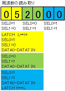 | 周波数は上の桁より10進表記で2桁づつ読出します。読み取り間違いがないはずですので1回読出しで確定します。 | |