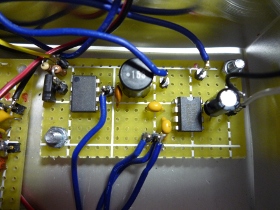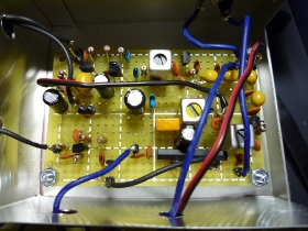 | 定番の電源制御回路を組み込ます。ACアダプターの電圧にもよりますが、この製作の場合DC9Vを想定しています。トランス式のACアダプターのため、消費電流が少ないと電圧が上がる傾向にあります。その時、2SA1385のトランジスタはかなりの発熱をします。今回はコレクタに放熱の処理を施しました。太目の銅線を接続して熱を放出する工夫をしました。銅線そのものの発熱は小さいですがトランジスタが熱くなるのを防ぐことが出来ました。 | |