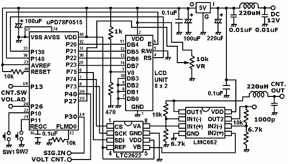 | ループアンテナの電圧制御には最大12Vの電圧が必要です。しかしながらマイコン回路からの制御の最大電圧は5Vです。この電圧をOPアンプで2.5倍することで12Vまで対応するようにしました。OPアンプの非反転増幅の回路計算より2.5倍するためには10kと6.7kを使用すればよいことがわかります。6.7kは10kと20kを並列接続することで簡単に出来ます。ほぼ正しい電圧が得られました。 | |