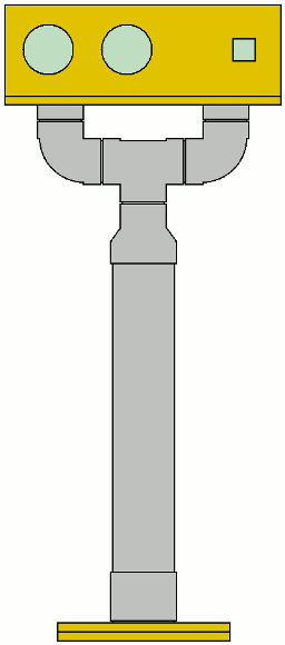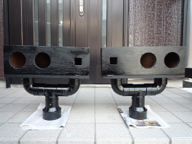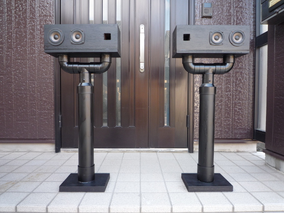 | 「どひゃー!」と驚かれたもしれませんね。そうです、通常縦型に配置するものを今回横置きにします。フロア型にしたいので、どうしてもこんな感じになります。今までの製作と同じように塩ビパイプで支えますが、さすがにセンター1本では安定性が無いと考え、Y字型で支えることにしました。私個人は「バズーガ」と呼んでいます。 | |