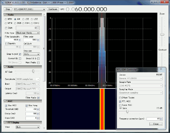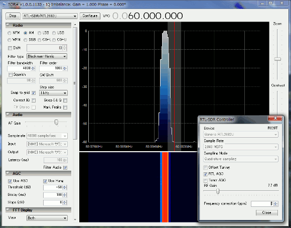 | あくまでもアップコンバータに使った水晶発振器がピタリの周波数で発振しているとすると、発振周波数を受信した場合、60MHzピタリとなるはずです。SDR#で調べてみましょう。 | |