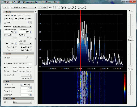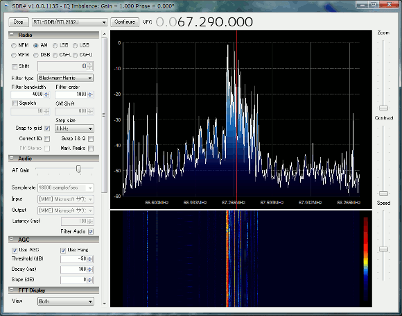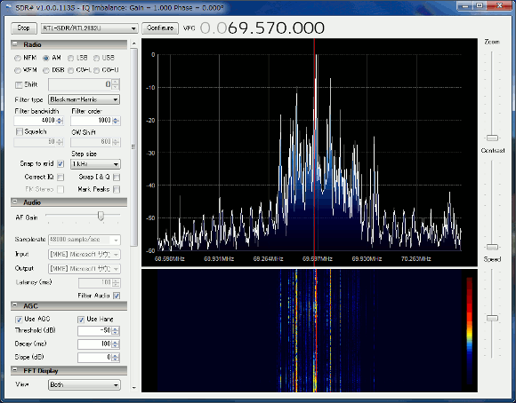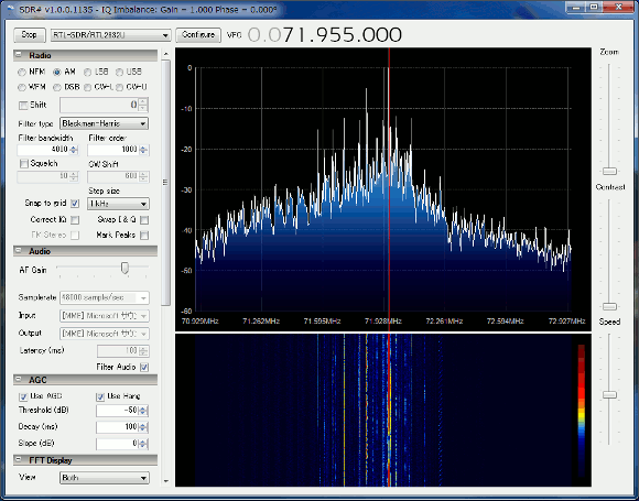 | アップコンバータを使って早速短波を受信してみましょう。私の場合ΔLOOP7のアンテナを使っていますので、アンテナ部でかなりのゲインが期待出来ます。従ってSDR#からのTUNER AGCはマニュアルにしてGAINを10dB弱として受信しました。 | |