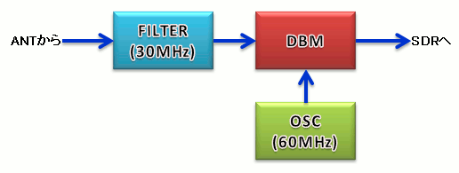 | コンバート用の水晶発振器の周波数が60MHzですので、アップコンバータの構成は次のようになります。(回路図は記載出来ませんので、上記雑誌を購入して下さい) | |
