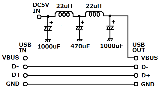 | 前回作ったUSB中継器の電源部分を外部電源対応に改造します。ここにDC5Vを入力すればUSB-DACはコネクタを通じて外部電源で動作するようになります。 | |