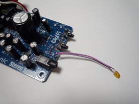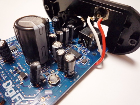 | バスパワーで動くUSB-DACはUSBコネクタの電源端子をカットして、基板に外部から直接DC5Vを印加すればうまく動きます。 | |