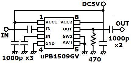 | 局発周波数を分周するプリスケーラICにはルネサスエレクトロニクス製のuPB1509GVを使います。SSOPタイプですので、変換基板に載せて使いましょう。エアーバンド帯域であれば簡単に分周してくれます。 | |
