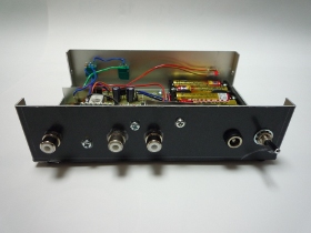 | 選局操作はボリュームで行います。局発の周波数範囲が広いので、操作はメインとファインの2種類を駆使します。背面の端子は左からアンテナ端子、10.7MHz出力端子、1/8プリスケーラ出力端子です。 | |