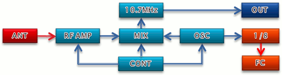 | コンバータとしては中間周波数10.7MHzのアンプ出力までを組み込みます。最近すっかり10.7MHzのコイルが無くなりましたので、千石電商さん買えるAMZコイルにセラミックコンデンサを組み合わせて使います。調整が必要になりますが、仕方ありませんね。私は14MHzのコイルと120pFで10.7MHz付近に同調出来るようにしています。 | |