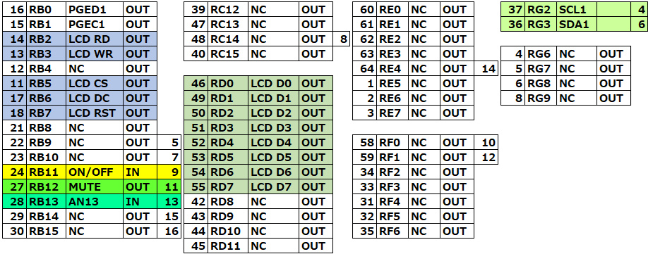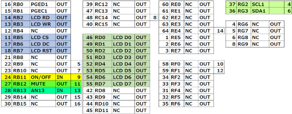 | 今回新設したMUTEボタンの接続先はポート割り付け表のRB11(ON/OFF)です。RB12(MUTE)は電子ボリュームICのMUTE端子に接続します。今まで使っていたボリュームはRB13(AN13)でアナログ的に位置を読み込む用に変更します。これで私のオーディオシステムの信号ラインからメカ的なボリュームは無くなりました。めでたしめでたし。 | |
