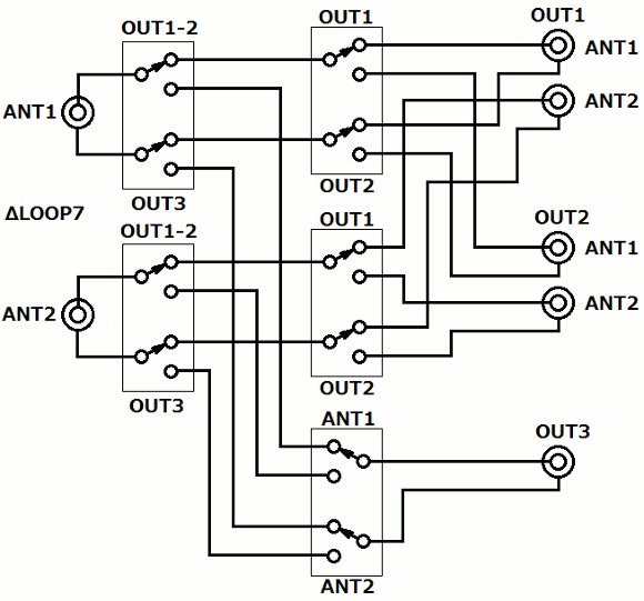 | ふたつのΔLOOP7アンテナをコントロールしながらふたつのAMラジオとひとつの短波ラジオにアンテナを接続できるようにします。同時に複数の機器で受信をすることはないので、各々のアンテナの行き先はひとつです。これらを考慮しながらアンテナ切換え部分の回路を考えます。 | |||||||||||||||||||||||||||||||||||||||||||||||||||||||||||||||||||||||||||||||||||||||||||||||||||||||||||||||||||||||||||||||||||||||||||||||||||||||||||||||||||||||||||||||||||||||||||||||||||||||||||||||||||||||||||||||||||||||||||||||||||||||||||||||||||||||||||||||||||||