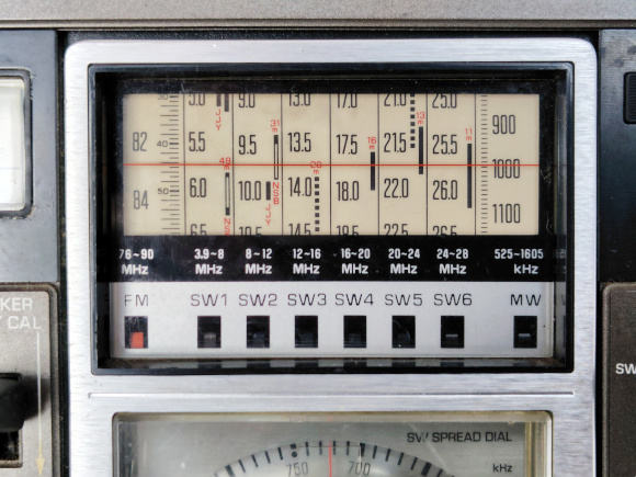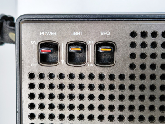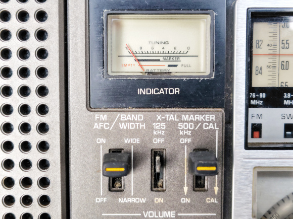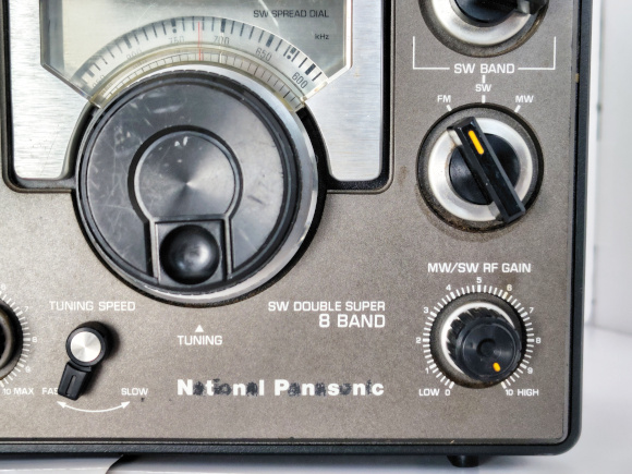 | 中波を聴いて遠くのAM局のベリカードを集めたり、短波で海外局を聴いたりしていましたが、私の中でのBCLブームは正直なところ数年で終わってしまいます。その後は父親が寝床に置いてラジオを聴いていたように思います。どこかで父親から返してもらって、長い間眠っていたのでした。今回はまず電源を入れずに外観を詳細に見ていくことにします。 |