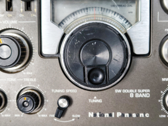 | この短波のバンド切り換えもメカ的には正常動作しています。このあたりちょっと汚れが気になります。ロゴは綺麗に残っています。SW4の4の数字が見えませんが、なんとかしましょう。 |