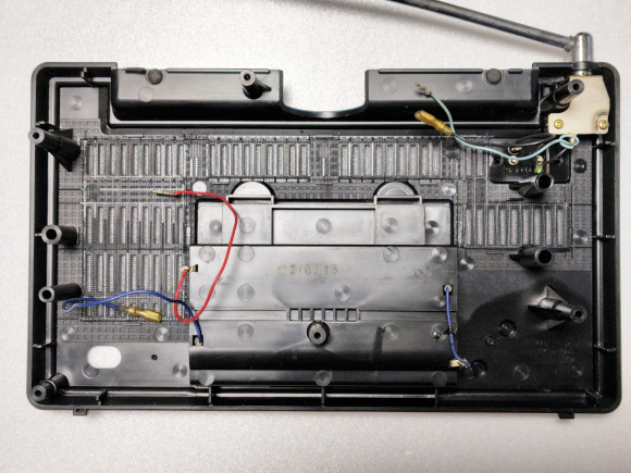 | 電池ボックスとアンテナ部分から出ている線はコネクタ式になっていますので、簡単に取り外し出来ます。何処に何色の線が刺さっていたか、写真を撮っておくと良いでしょう。 |