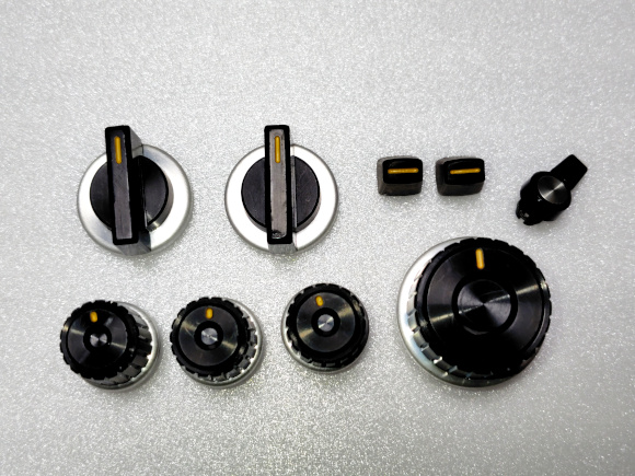| ボリュームノブやスイッチノブはお湯を張った容器に洗剤を入れて、その中で古い歯ブラシなどを使って洗浄します。あら、新品のようになったわね。 |