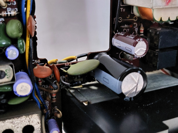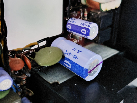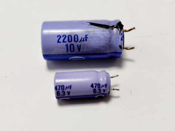 | POWERスイッチもLIGHTスイッチもエージングで蘇りました。しかしながら電源回路の出力電圧は低いままです。ここで定番の電解コンデンサの取り換えです。2200uF/10Vと470uF/6.3Vの電解コンデンサを取り外します。 |