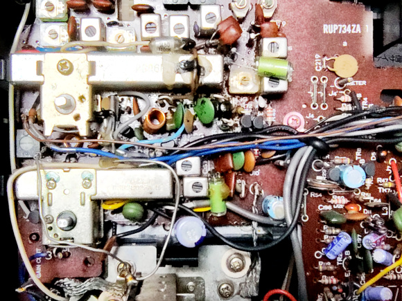 | ジャイロアンテナを持ち上げても、筐体に寄りかかっているだけで、自立保持しておりません。まずはこのジャイロアンテナを取り外すことから始めます。私の機種の場合、ジャイロアンテナの配線は基板上のピンに直接はんだ付けされています。この線を取り外しましょう。 |