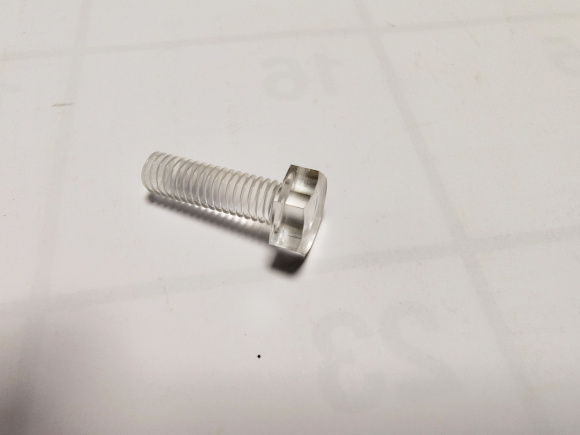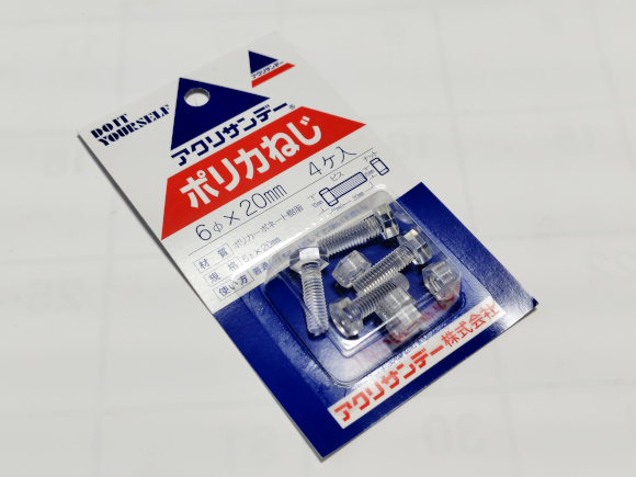 | ポリカ樹脂は強度があり、割れずに加工が出来るという特徴があります。今回の複製再現するのに最適と思います。ある程度の厚みが必要になりますので、私の製作で定番のポリカねじを購入してきました。 |