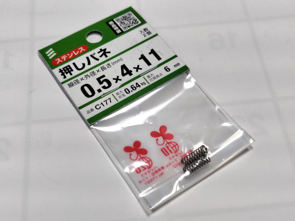 | 日曜大工センターのバネのコーナーで物色。外形4mmのものを購入。 |