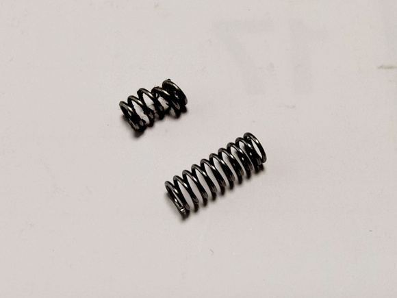 | 外形はほぼ同等と思われます。長さが異なるので、カットして使用します。長さは実際に組み込んでみないと判らないので、元バネより長い位置でカットしておきます。組み込み後の調整はバネを円周の1/4づつカットしながら行います。弱いと自立保持出来ませんので、後行程で慎重に行います。 |