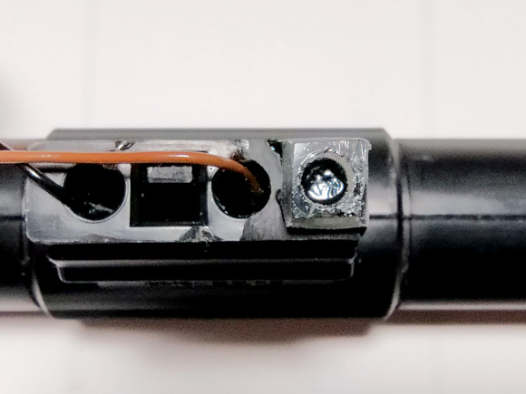 | 筐体にはしっかりとワッシャーを介してサークリップで固定されています。なかなか取り外す作業に苦労しましたが、サークリップの原理を知っていたらどう外せば良いかわかります。他の所を傷つけないように慎重に作業しましょう。ワッシャーが数枚挟みこまれていますので、順番を間違えないように保存しておきます。 |