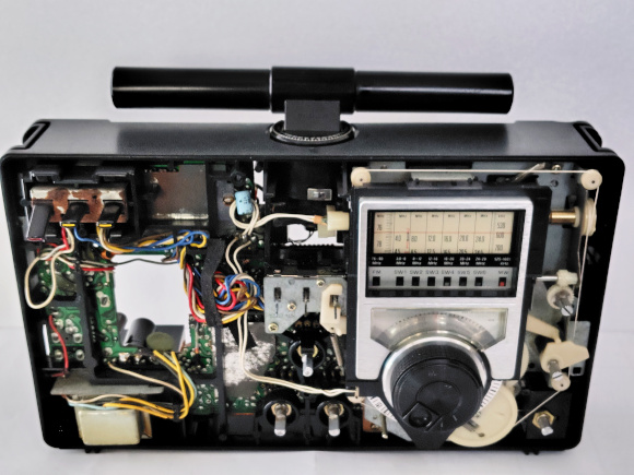 | 今回はジャイロアンテナを修理します。長年の使用に耐えきれず、AM用のジャイロアンテナは自立保持しなくなっています。これをどうにかして元に戻したいと思います。さて「カチッ」音は蘇るのでしょうか。 |