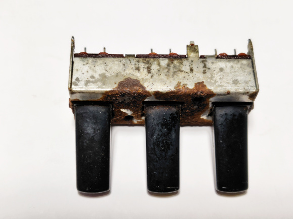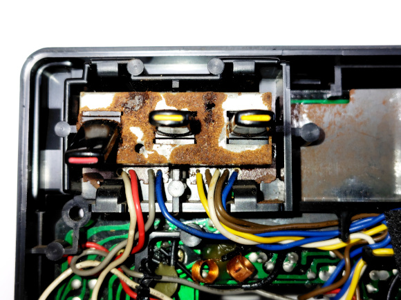| 先ほどのスイッチと同様に、接点端子も、接触片も表面が痛んでいます。アルコールで綺麗に掃除しましょう。全て元に戻して、スイッチのメンテナンス完了です。先ほども同じですが、筐体に戻す前には、テスターでスイッチの切り換えが正しく出来ているかのチェックが必要です。 |