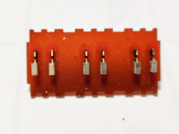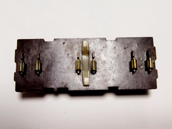 | うわー!こりゃあダメですなあ。接点端子も、接触片も表面が痛んでいます。接触片はアルコールで洗浄。接点端子は柔らかい歯ブラシでアルコールでゴシゴシ。決して傷めないように。接点の表面はピンセットのとがったところで、ゴシゴシすると綺麗になります。洗浄後は自然乾燥させて、元通りにしましょう。 |