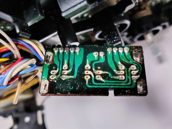 | このスイッチモジュールは簡単に筐体から取り外すことが出来ます。スイッチの接点を洗浄するために慎重に基板からスイッチ部分を取り外す必要があります。私ははんだ吸い取り線で取り付け部と端子のはんだを除去しました。 |