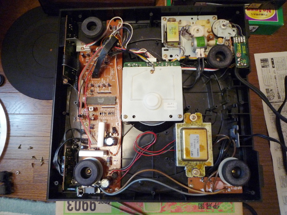 目視レベルでは回路に大きな損傷は無いようです。心配していた電解コンデンサも無事のようですので、一旦そのままで使用することにします。日本製の電気部品を使っていますので、ここまで寿命があったのか、とも思いました。しかしながら100VのケーブルとPHONO出力のケーブルはかなり汚れていますので、後で交換します。最初にプレーヤーを支える脚をメンテナンスします。 | |