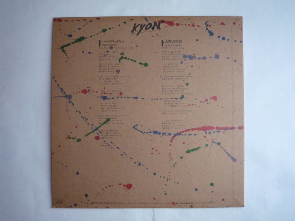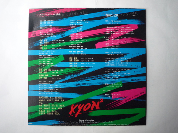Kyon2のセカンドアルバムです。今でもシングルのベスト版CDはよく聴きますが、アナログレコードで聴くとまた格別なものがあります。あたり前ですが声がとても若いです。「ひとり街角」ではKyon2が京都駅前の大手デパートの屋上にレコードのキャンペーンに来た時、初めて握手をしたのを覚えています。私は、京都の大学に通う学生でした。この時はこれほどまでに息の長い歌手・女優になるなんて想像も出来ませんでした。アルバムオリジナルの曲がとても懐かしく感じます。B面にはKyon2の語りが入っている曲がありますが、今聴くととても恥ずかしいです。Kyon2のボーカルが生々しく聴こえます。これがアナログレコードの魅力なのでしょうか。 | |