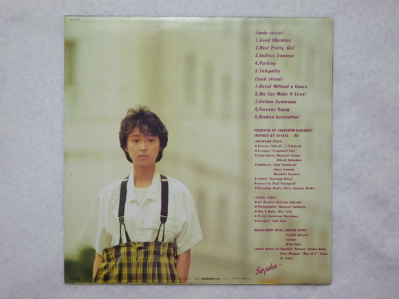 A面1曲目「グッド・バイブレイション」、この時の声はまだ聴きやすいです。無理はしていない感じです。ロック調ですが、アイドルソングっぽい感じです。この曲もノリノリで私は好きです。A面3曲目「エンドレス・サマー」、この曲はとても優しい声で歌ってます。でもちょっとかすれたようにも聞こえます。これは後に判ることになるのですが、声帯に変調をきたす前兆でしょうか。サウンドもとても優しい感じになっていてとても良いです。花の82年組としてデビューしながら、あまり日の目をみなかったのはなんだったのでしょうねえ。結構歌は上手いと思うのです。この曲も好きですね。B面1曲目「理由なき反抗」、さすがシングル曲です。私はこのイントロがとても気になります。そして好きです。サビのメロディも良いです。何かリアルタイムで聴いていた記憶が蘇ります。アレンジも良いです。さやかさんに合ったサウンドです。歌的にはとてもツッパッてますが、可愛かったですよ。大ヒット曲はないけれどファンでしたね。B面3曲目「不良症候群」、この曲もいいですね。B面1曲目と同じくヒットメーカーの鈴木キサブローさんの作曲です。メロディ、アレンジが私好みです。とても良いと思います。B面4曲目「フォーエバー・ヤング」、いきなりのバラード調をもってきました。とても落ち着いたサウンドです。こんな曲が心を癒してくれます、さやかさんの歌声と共に。とても良かったです。B面5曲目「ブロークン・ジェネレーション」、どのクレジットを見ても当時のヒットメーカーの先生揃いです。これは伊藤銀次さんの曲です。とてもしっとりとしたサウンドです。この頃の声は結構かすれてます。ちょっとしんどそうな歌い方になってきています。リアルタイムにそういう声の変調を知ってあげることが出来ず、ささやかなファンとしては、心残りです。この曲も良かったです。当時のアナログレコードを聴くことで私自身も若い頃の自分に戻れたような感覚になってとても幸せです。アナログレコードって本当に良い記録メディアですね。 | |