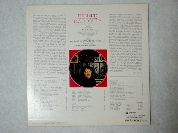 シンセサイザー・アルバムの第三弾です。A面はストラヴィンスキーのバレエ組曲「火の鳥」を冨田勲氏がアナログシンセサイザーでアレンジした曲です。クラッシックが原曲ですがとてもシンセチックなサウンド作りです。前作「展覧会の絵」は圧倒的な迫力で迫ってきた演奏でしたが、この「火の鳥」はどちらかというとおとなしめのサウンドになっています。所々にアナログシンセ独特の音色が聞こえてきて、とても楽しめる作品です。下手な表現で申し訳ないですが、まるで幽霊が出てくるような「ヒュ〜ン」という音はトミタさんの好きな音色なんでしょう。とても神秘的なサウンドです。クラッシックを超えていると思います。ライナーノーツには、シンセサイズされている、と表現されていました。こうしてジャケットを眺めたりライナーノーツを読んだりしながら音楽を聴くのもアナログレコードならではですね。やはりアナログレコードは最高の音源デバイスと思います。これからもまだまだ続いて欲しいです。B面2曲目はムソルグスキー交響曲「はげ山の一夜」です。楽器の音色のコピーではなくアナログシンセでしか出せない音色がふんだんに使われています。このアルバムの中では一番勢いのあるサウンドです。やはりこれくらいの圧倒感で押しまくって欲しいですね。まさしくクラシック音楽をシンセサイズされた音楽です。アナログシンセサイザーサウンドの大家であられた冨田勲さんの功績を音楽を通して改めて認識させて頂きました。そしてそれを再現してくれたアナログレコードに感謝です。 | |
