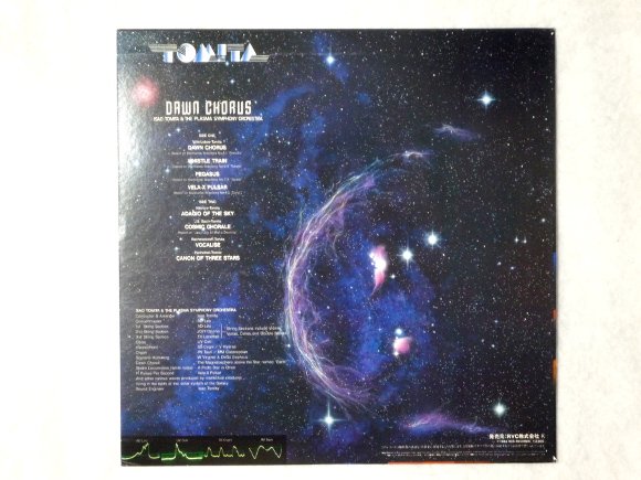 A面1曲目「ドーン・コーラス」、このアルバムのコンセプトは宇宙からやってくる星の光の波をシンセの音の波形に置き換えてオーケストラを構成した内容になっています。今更ですが、ライナーノーツにその説明があります。その内容のがとても詳細で大変興味深いです。こういうところがアナログレコードの良い面です。それをしみじみ眺めながら音楽を聴くとなるほどそうなのかと感心してしまいます。ピューイピューイとかドカーンとか鳴る音がとても気持ち良かったです。A面3曲目「ペガサス」、私はもともとシンセサイザーの音が好きです。もちろん楽器の音も好きです。しかしシンセサイザーにしか出せない音色もあってその音が私の心を揺さぶったり穏やかにしてくれたりと変幻自在。そんなところが好きなのです。今まで聴いたことのない音色で心を和ませてくれる、とても幸せな時間です。A面4曲目「パルサーからの呼びかけ」、これも良い音色のシンセサウンドです。心がとても落ち着きます。クラッシックでありながらも宇宙の雄大さを感じることが出来ます。こんな風にいろんなことにシンセサイザーで挑戦された冨田さんってとても素敵な方だなと思います。B面1曲目「天界のアダージョ」、おしよせてくる悲壮感がすごいです。そしてそれを強調するシンセの音色、何かとても寂しい感じが。ひょっとすると宇宙はとても寂しい世界なのかもしれないですね。でもその広がりは壮大で無限。そんなことを連想させてくれる曲です。とても良かったです。B面2曲目「コズミック・コーラル」、この曲はよく聴いたことがあります。でもシンセが奏でる曲はまた違った色に聞こえます。音楽って本当に不思議です。こんなに雰囲気が変われるのですから。そしてシンセのその能力には驚きの連続で、それを最大限に引き出している冨田さんに感動です。B面4曲目「三星のカノン」、これもよく聴きます。とても優しい曲です。宇宙からの優しい贈り物。シンセの音色が私の心を癒してくれます。またにはこうしてゆったりとした気分でクラッシックのシンセ音楽を聴くのも良いです。クラッシックのいいとこ取りですから聴いていてとても楽しくなります。その選曲のセンスにも脱帽です。冨田さんの音楽は今でも生きています。 | |