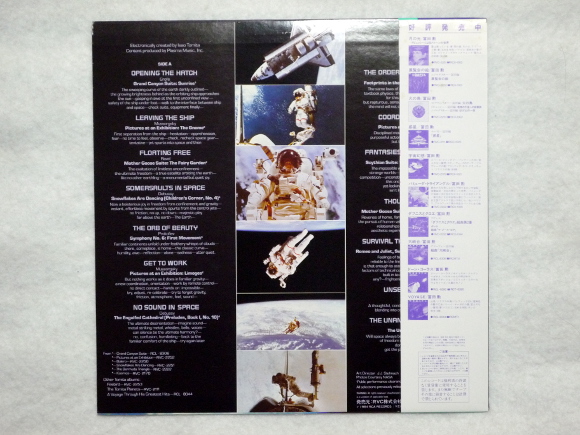 A面1曲目「ハッチを開けて」、クラッシックをシンセでアレンジし、演奏されているコンセプトは同じですがオリジナルのクラッシックを知っていると聴いていて楽しいです。でもこの曲は私は初めてかも。オリジナルの旋律からアルバムタイトルの曲に沿った部分を選び出して新たにタイトルを付けるというセンスは凄いと思います。それらしい曲に聞こえるのもなんとも不思議です。A面3曲目「宇宙遊泳」、タイトル通りの曲に聞こえるところが凄い。シンセの音色も良いですね。やっぱりシンセでしか出せない音色っていうか冨田さん独特の音色っていうか、まさしく冨田サウンド。仕事に疲れた私の身体を癒してくれる素晴らしい音楽。A面7曲目「音のない宇宙」、ちょっと私には難しい曲かも。シンセの音色で男の人や女の人のコーラスのように聞こえるところはなんとも言えず鳥肌もんです。B面3曲目「SF幻想」、わからないこともない、でもあまりついていけない自分がいます。クラッシックをほとんど聴かない私の事情ではありますが、やっぱり聴いたことのあるクラッシックでないとちょっとね、とわがままを言ってみる。少し息切れを感じてしまう。でもサウンドのスケールは大きくとても深い世界を感じます。B面7曲目「答えのない質問」、広い広い宇宙空間の中で何を問いかけるのか。たとえ問いかけても何も返ってこない。やっぱり宇宙そのものは静かで深い空間でしかないのでしょう。今回は少し心に響く曲が少なかったようです。それが何なのかわかりませんが。もっと楽しくなる音色を奏でて欲しかった、というのが正直な感想です。でも冨田さんのシンセサイザーへの取り組みは素晴らしいと思います。 | |