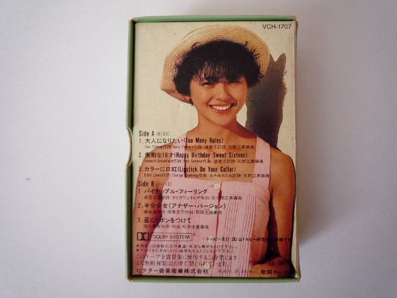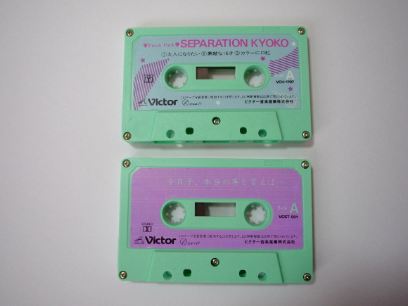 歌カセットのA面は洋楽のカバーです。結構古いのをカバーしています。A面1曲目「大人になりたい(Too Many Rules)」、2曲目「素敵な16才(Happy Birthday Sweet Sixteen)」、3曲目「カラーに口紅(Lipstick On Your Collar)」、今またカセットテープにも脚光が浴びていますがほぼ完璧な状態で今まで保存されていたというのは奇跡です。どの曲もよく聴いた洋楽です。Kyon2の若い可愛い声がとてもマッチしています。カセットで聴く音楽もまたいいものです。B面2曲目「半分少女(アナザー・バージョン)」、時期的にはシングル半分少女の後に出たカセットなのでこの曲が入っているのですね。アレンジがシングルと違っています。ピッチが少し速いかも。Kyon2の声は相変わらず可愛いです。B面3曲目「星にリボンをつけて」、とてもしっとりとした曲です。Kyon2のボーカルがきらきらしてます。もうひとつのカセットはインタビューカセットです。今聴くととても恥ずかしい感じがします。でもKyon2の声はとてもキュートです。いくつかのお題に対してしゃべっています。詩の朗読もあります。当時のKyon2の想いなので今聞くととても懐かしい。私的にはカセットテープがここまで素晴らしいということに改めて感動です。 | |