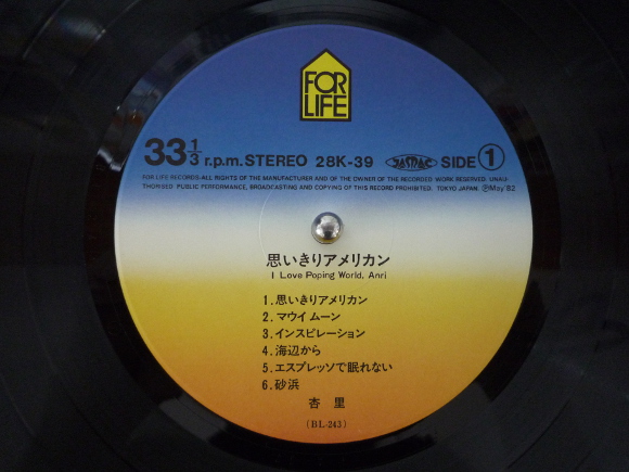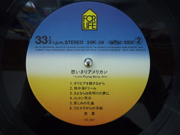 A面1曲目「思いきりアメリカン」、うーん良いですね。このアナログレコードの音、そしてとても懐かしいこのサビのところ。たしかCMソングだったと思います。蘇りますねその時代が。今こうして聴くととても音が豊かです。細かく計算されたアレンジがさりげなくって感じ。とてもリズミカルで楽しくなる曲です。A面5曲目「エスプレッソで眠れない」、この曲調好きです。ちょっと杏里さんっぽくないところがまたいいです。メロディもいいし、サビの部分がとても面白い。くせになります。B面1曲目「オリビアを聴きながら」、イントロから引き込まれます。名曲です。このしっとり感がたまりません。懐かしさが込み上げてきます。当時よく聴いていた曲です。そんな曲を今こうしてアナログレコードで聴けることに感謝です。心落ち着く曲です。サビの部分も素敵です。本当に80年代って良い曲が多かった時代でした。B面4曲目「コットン気分」、これもCMで聴いた曲です。何か当時のTV画面が目の前に浮んでくるような感じ。そうこのサビの部分。とてもキャッチーなメロディが耳に入ってきて思わずTVに振り向くって感じ。B面5曲目「悲しみの孔雀」、しっとり系です。それもかなりの。とても穏やかに杏里さんが歌われています。まるで菩薩様のよう。威厳のある曲調に心が落ち着きます。アレンジもそれにピッタリとマッチしてます。とても良い曲です。 | |