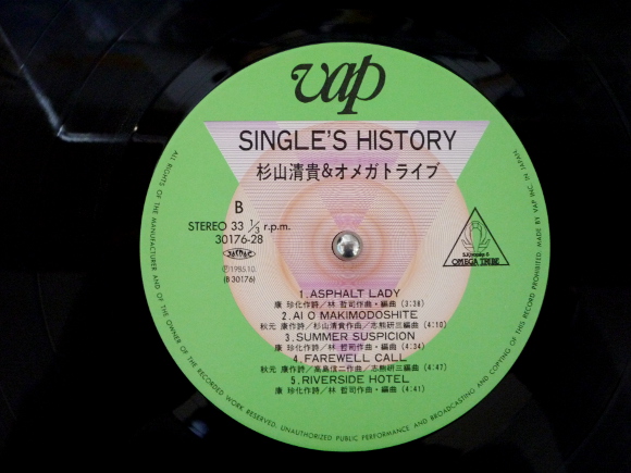 A面1曲目「君のハートはマリンブルー」、このゆったり感、なつかし感、80年代が蘇ってきます。ボーカルがしんみりと心にしみてきます。記憶に残っているサビの部分がとてもよいです。A面3曲目「ふたりの夏物語-NEVER ENDING SUMMER-」、いいですね。とても懐かしい。CMソングでしたよね。サビの部分。今でも思い出されます。とても爽やかなサウンドに杉山さんのボーカルがマッチしていて今聴いても充分味わえます。やっぱり80年代の音楽は一番良い時代であったのかと、よく思います。オンリーユー・・・そうそこなんですよね、いいところ。B面1曲目「ASPHALT LADY」、杉山さんにはちょっと感じの変わった曲調。南佳孝さんの曲調に似てる感じがしないでもない。セカンドシングルでこんな感じだったんですね。面白いサウンドにちょっと驚き。B面3曲目「SUMMER SUSPICION」、この曲はよく聴きました。ファーストシングルでしたね。TVの音楽番組で杉山清貴&オメガトライブとしてのサウンドを一発目に確立したことで良いのではないでしょうか。こんな感じの曲を今後も届けていきますと。B面5曲目「RIVERSIDE HOTEL」、イントロがいいですね。この入り方。でもほとんど聴いた記憶がありません。すみません。やっぱり杉山清貴&オメガトライブとしては5枚目シングルのふたりの夏物語がいちばん記憶に残っています。アルバムとしてはベスト盤として大変楽しめました。その楽しみを届けてくれたアナログレコードに感謝です。 | |