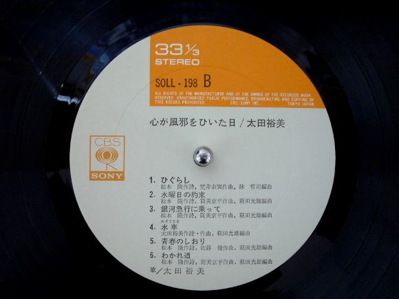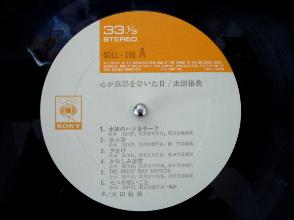 A面1曲目「木綿のハンカチーフ」、名曲です。懐かしい。海外のカラオケ屋で歌ったのが何故か懐かしい。太田裕美さんの伸びやかな高域が心地よい。とても可愛い歌詞で青春ソングっていうか、当時若かった私達に勇気をくれた歌でした。とレコード聴いた時に記した感想ですが、恥ずかしい。最近平成生まれの若者に昭和歌謡ブームっていうテレビ番組が多くあって、この歌が詳細に解説されています。その内容をこの歳になって見ていると、当時の私はいかに平凡であったというか何も知らなかったのね、という感情を認識させられてます。自分が単純だったのだと。テレビで解説されたことで、そういうバイアスが掛かって聴くと、とても深い歌詞だったのだと。A面4曲目「かなしみ葉書」、さみしそうなメロディライン。心に迫ってくるものがあります。アレンジも悲しみを誘います。そして懐かしさが襲って、涙が出そう。A面6曲目「七つの願いごと」、寂しさ全開のメロディと歌詞、そして歌い方。優しさの中にも悲しみが伝わってきます。歌詞にうるっとするところがあって、段々と盛り上がってくるサウンド。けど寂しさは逆に大きくなっていく。B面1曲目「ひぐらし」、一転して明るいメロディラインになりました。裕美さんの歌声もとても可愛く感じます。ボーカルの特徴を生かしたサウンド作りになっています。40年以上も前の歌声を今聴かせてくれるアナログレコードは本当に素晴らしい。B面2曲目「水曜日の約束」、当時のTVドラマの主題歌のような曲調です。裕美さんの伸びた高域がとても綺麗です。アレンジがドラマの曲を連想させます。B面4曲目「水車」、裕美さん自身の作詞作曲です。入り方が演歌っぽくって曲調も演歌。とても懐かしい感じがします。カタコト、カタコト、っていうところが私の心にスーっと入ってきます。サビへと続く部分がとても良いです。何度も言いますが、やっぱりアナログレコードは大変優れた媒体です。何十年経っても色あせないサウンドが詰め込まれた玉手箱のようです。 | |
