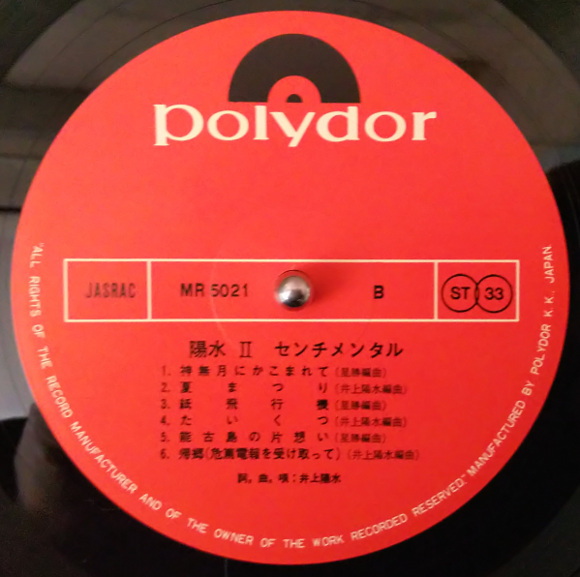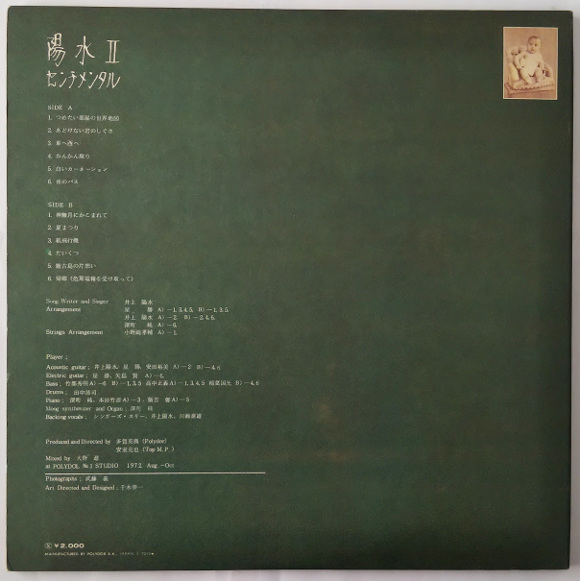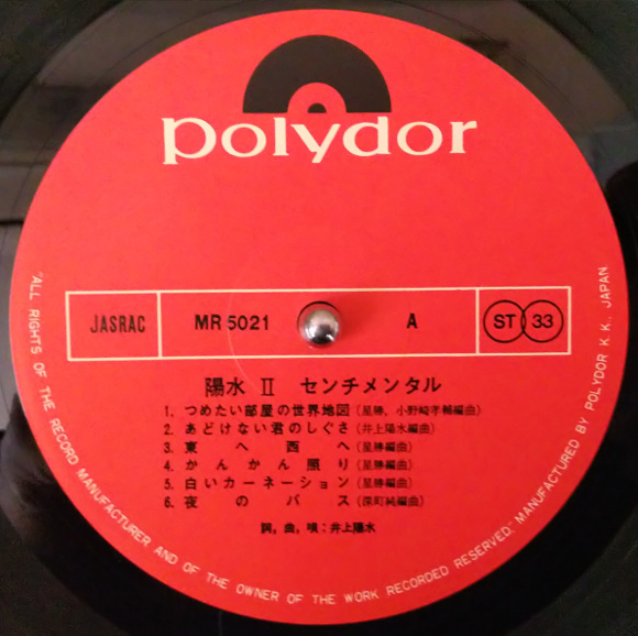 A面1曲目「つめたい部屋の世界地図」、アナログ独特の空間の広がりが最高です。陽水さんの透き通るボーカルがメロディとマッチしていて清らかな気持ちになります。ハアっというところのボーカルのエコーがいいですね。A面3曲目「東へ西へ」、この曲は当時から好きでした。こうして今聴いても良い曲です。なんか50年経っても何も変わっていない世の中なんだと思うところもあります。ガンバレみんなガンバレっていうところのメロディが好きです。A面4曲目「かんかん照り」、陽水さんの時代って歌詞で聴かせる曲が多いです。左右から聞こえるギターとセンターのベースの配置がまるで目の前に見えるような広がりを感じます。これがアナログレコードなのかって思います。時代を経てもサウンドは新鮮。A面6曲目「夜のバス」、とても暗そうな感じのイントロから入りました。陽水さんのボーカルの素晴らしさに感激。アナログレコードはA面B面があるからA面の最後にもってくる曲って重要ですよね。この曲は沢山の楽器が入り乱れて重厚なサウンドになってます。まさしくA面のラストにふさわしいと思います。B面1曲目「神無月にかこまれて」、このアルバムで一番好きな曲です。最初のギターの入り方は鳥肌ものです。今改めてアナログレコードを聴くととても良い音質で録音されていると感じます。CDでは味わえないこの感覚。B面4曲目「たいくつ」、このささやかな日常を切り取って曲にするとろは凄いと思います。アコースティック感が曲ととてもマッチしています。何か私の心の底を覗き込んでくるようなサウンドにとても懐かしさを感じます。この頃私はまだ小学生だったと思います。何十年経ってもアナログレコードには癒されますね。今の時代にピッタリです。とても良いアルバムでした。 | |