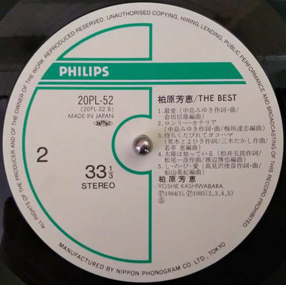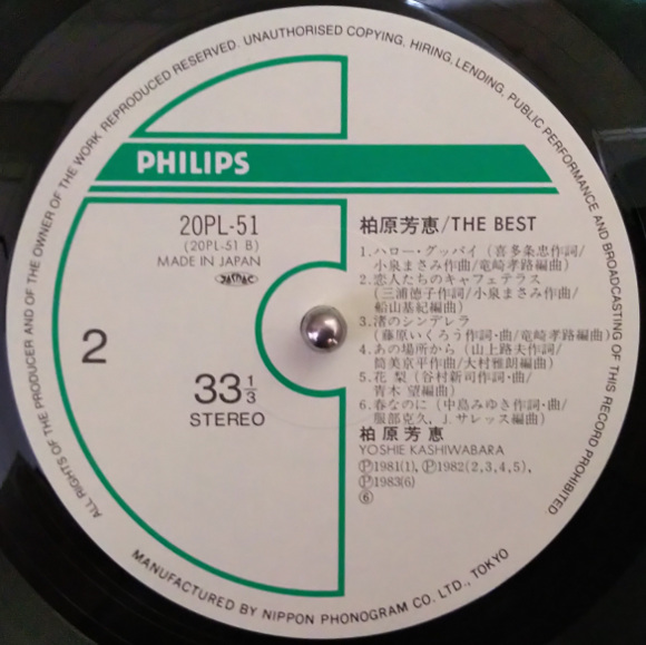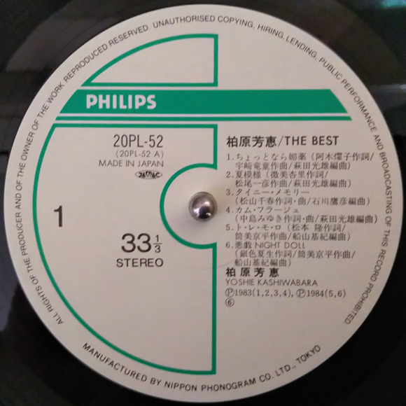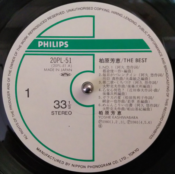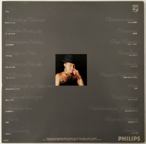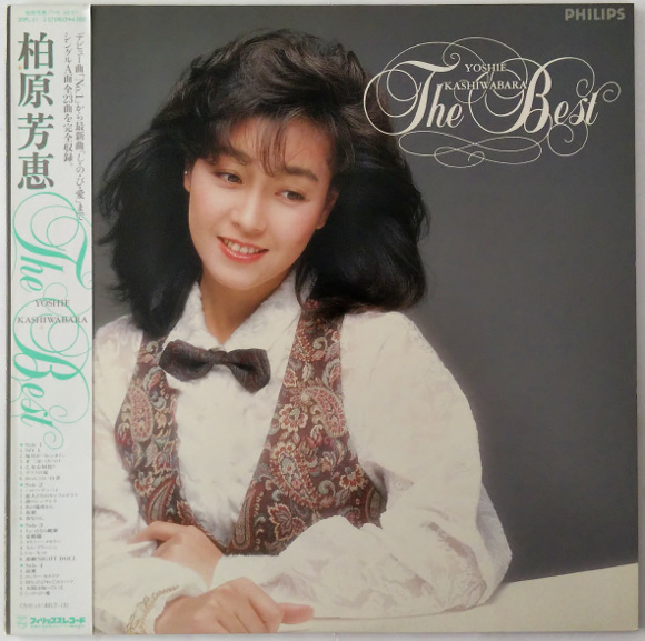 A面1曲目「No.1」、デビューシングルです。あれ?こんな声だったっけ、という最初の印象。リアルタイムではあまり聴いたことなかったように思いますがテレビの歌番組では見た記憶があります。A面2曲目「毎日がバレンタイン」、そうそう、芳恵さんはこの声ですよ。とてもポップな曲です。芳恵さんらしい、ヘイボーイ、ヘイヘイボーイって歌うところが癖になりそう。A面4曲目「乙女心何色?」、いきなりのサビから始まります。跳ねるようなウキウキ感がとても印象的。なんと近田春夫先生の作詞曲ではないですか。今更ですが感激しています。曲のイメージからすると芳恵さんのイメチェンを狙ったのかも。サビの乙女心何色って歌うところがとても可愛いです。B面1曲目「ハロー・グッバイ」、芳恵さんの名曲のひとつです。私の一番好きな歌です。イントロがなんともいえない哀愁を誘っています。とても可愛い曲ですが、私はこの曲をカラオケで歌うのです。この曲で芳恵さんはアイドルの階段を一気にジャンプアップした感じがしています。B面2曲目「恋人たちのキャフェテラス」、これもいきなりサビから始まります。このサビの部分は記憶にはっきりと残っています。ホップ、ステップ、ジャンプっていうところで心が気持ち良くなります。船山基紀さんのアレンジも最高です。この曲気に入りました。サビ前のメロディが私の心に入り込んできます。B面5曲目「花梨」、これは谷村新司さんの作詞曲です。サビの花梨、花梨っていうところのメロディラインがなんとも谷村さんらしい曲調です。アレンジもとてもキュートで良い曲です。B面6曲目「春なのに」、芳恵さんの名曲のひとつ、中島みゆきさんの作詞曲の素晴らしい曲です。芳恵さん的には大ヒット曲ですね。今聴いても名曲です。サビの春なのにお別れですかっていうところが私はとても気に入っています。壮大な雰囲気のアレンジは今の時代にも納得です。 | |