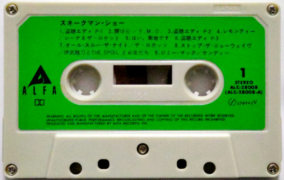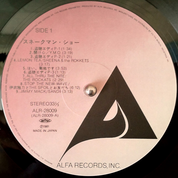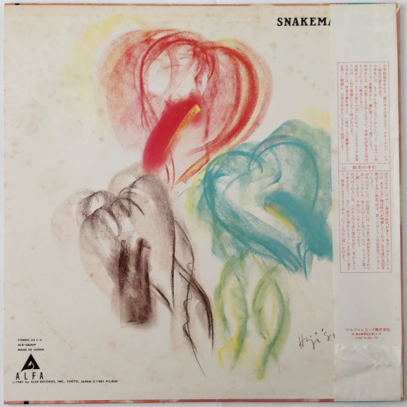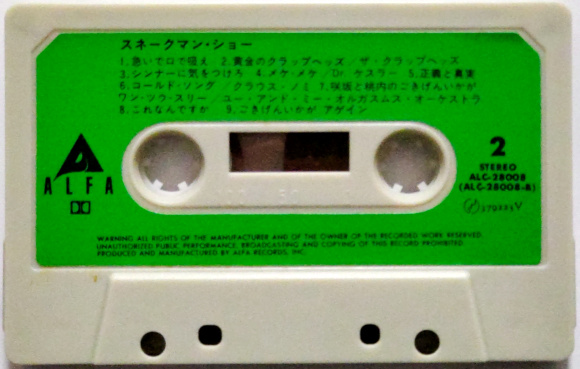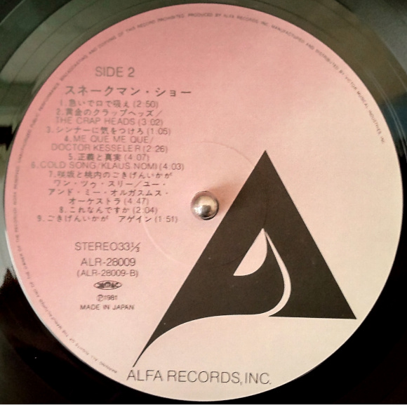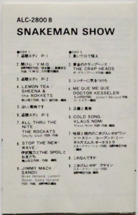 スネークマン・ショーのコントの間に楽曲が配置されている構成です。コントの部分のコメントはありませんので、皆さん実際に聴いてみて下さい。A面2曲目「開け心」YMO、この曲はベスト盤でもよく聴くので好きです。ライナーノーツには、謎のモノラル録音の意味するものは・・・・、と記されています。まあ、聴く限りでは歌詞の内容は全くわかりません。A面4曲目「LEMON TEA」シーナ&ロケッツ、二人で飲み干すレモンティー、甘くて酸っぱいレモンティー、ってところは随分前に聴いたような感覚です。鮎川さんのエレキギターが炸裂、シーナさんのボーカルも素敵。A面7曲目「ALL THRU THE NITE」ザ・ロカッツ、ライナーノーツには、よくぞ生まれて来た、イカスぜロカビリーグループ、ザ・ロカッツ、ってなってますが、ロカッツ、って何? A面8曲目「STOP THE NEW-WAVE」伊武雅刀とTHE SPOILとお友達、盗聴エディを知っているから、このアルバムをリアルタイムで聴いていたはずだが、この曲の記憶はなぜか薄い。これは曲なのか、ギャグコントなのか?B面4曲目「Me Que Me Que」ドクター ケスラー、そうかメケメケっていう歌ですね。この曲はよく知ってます。子供の時に、思い出のメロディーで多分聴いていたと思います。ライナーノーツには元々美輪明宏さんが歌っていた曲だと。このアルバムで歌っているのはドクター ケスラーとなってますが、明らかに加藤和彦さんですよね。声を聴くだけで顔が浮かんできます。B面6曲目「COLD SONG」クラウス・ノミ、この曲は好きですね。ちょっと宗教しちゃってますよね。個人的感想です。B面7曲目9曲目「咲坂と桃内のごきげんいかがワン・ツゥ・スリー」ユー・アンド・ミー・オルガスムス・オーケストラ、ヒアウイゴー、エブリボディ、カモンロックンロール、っていうところ思い出しました。当時はこんな曲も聴いていたんですね。楽しい世の中でした。今こそこういうエンターテインメントが必要ですよね。サウンドギャグコントとでも言うのでしょうか。とても面白い曲でした。作曲は細野さんですね。メロディラインが妙にクセになって抜けきれないですね。いやー、面白かった。でもこんなアルバムは今の時代には発売出来ないでしょうって感じです。ヤバいです、コントのところ。なぜかギャグコントの部分は全て知ってました。やっぱりリアルタイムで聴いていたということですよね。こんな危険なアルバムを今聴けるのもアナログレコードの魅力です。 | |