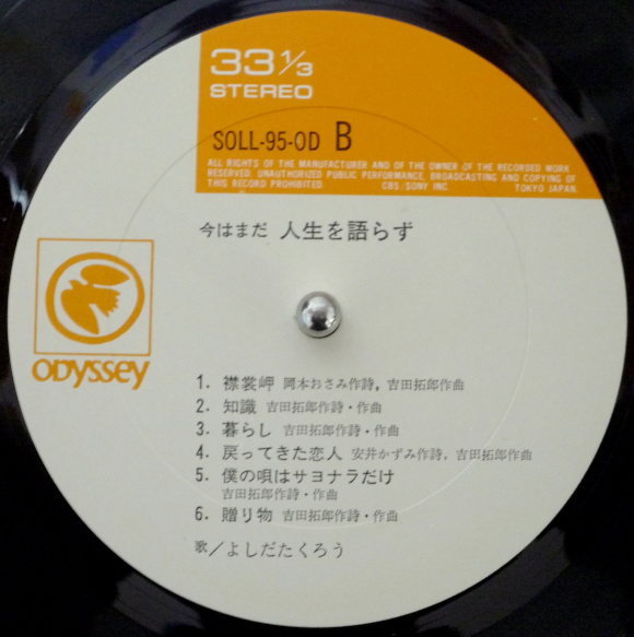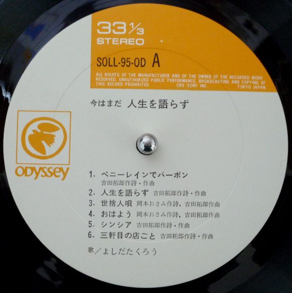 A面1曲目「ペニーレインでバーボン」、軽快なサウンドです。拓郎節満開。この早口でうたう歌い方が拓郎さんです。この曲が聴けるこのアナログレコードはとても貴重なものです。曲がいいのはもちろんですが、この頃のフォークソングは歌詞が重要です。きかせてくれます。A面2曲目「人生を語らず」、半分くらい叫びながら歌ってます。やはりひとつの時代を作った人ですね。拓郎さんはオンリーワンです。声がガラガラになっても歌い続けているその破天荒さがいいです。アレンジがこの時代にしては新鮮に感じます。A面6曲目「三軒目の店ごと」、ライナーノーツにはA-6 自宅録音と書かれてます。なになにとても音場が広く感じられていいですね。ごちゃごちゃ感が全くなく音場がすっきりしています。歌詞がとても面白いです。なんかドリフターズを連想させるフレーズがありますがこれも拓郎ソングなんですね。楽しい歌でした。B面1曲目「襟裳岬」、森進一さんの歌です。拓郎さんが歌うとまた違った感じに聞こえます。それは演歌ではなくフォークソングです。ちょっとあっさりとした歌い方が何かの爽やかさを呼び込んでいるようです。これから冬があけようとしているのかも。B面5曲目「僕の唄はサヨナラだけ」、イントロのアレンジが新鮮に聞こえます。これも歌詞で聴かせる歌ですよね。語りかけるような歌い方が拓郎節なんでしょうか。何かうまく言い表せませんけど拓郎さんなんですよね。B面6曲目「贈り物」、ハーモニカのイントロがいいですね。正直なところこのアルバムで初めて聴く曲のほうが多かったと思います。アナログレコードは過去のいろんなことを語りかけてくれます。そのアナログレコードを未来にも残して繋いでいきましょう。音楽はやっぱり不滅ですよね。 | |