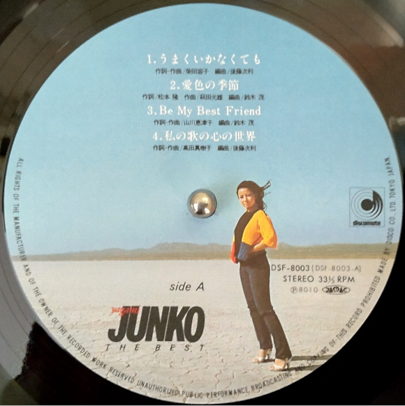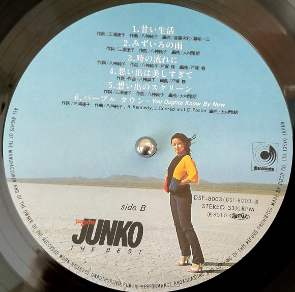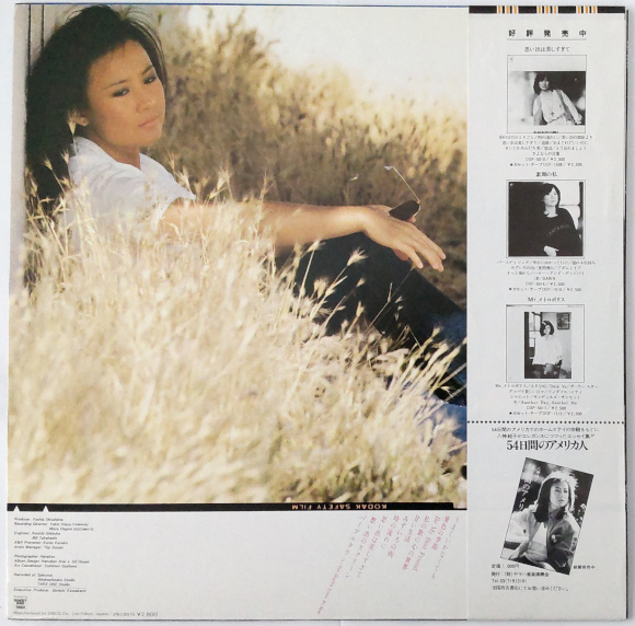 A面2曲目「愛色の季節」、スローテンポな曲です。とても落ち着くメロディライン。夜のお洒落な店でアルコールを飲みながら聴きたい気分になってきます。心をとてもゆったりとする気持ちにさせてくれるサウンド。後半のアレンジに純子さんの伸びやかな高音のボーカルがとてもマッチしています。A面4曲目「私の歌の心の世界」、ゆったりとしたメロディ。心が広がる感じ。カバーソングですが、純子さんの包容力に包まれた歌声が素敵です。A面の作曲は八神さんの曲ではないので、個人的にはちょっと違和感ありです。アルバムのコンセプトかもしれませんけど、ベストならA面にヒット曲を並べて欲しかった。A面は新録音となっていますので、このベストアルバムのための歌ですね。B面1曲目「甘い生活」、これがいわゆる八神サウンド。最高じゃないですか。伸びる高音の歌声が魅力的です。ミディアムテンポのゆったりとした感じがいいですね。サウンド的に厚みがあってアナログレコードからも伝わってきます。そして力強いアレンジになっていて、芯の強さが感じられます。最後のコーラスも良い感じ。B面2曲目「みずいろの雨」、あ〜〜、みずいろの雨〜〜。懐かしい、とても懐かしい。このボーカルはまさしく八神純子さん。ちょっと語り掛けるような部分があってとても可愛いです。純子さんのボーカルを聴いていると、とてもスッキリとした気持ちになれます。の〜〜お〜〜お〜〜お〜〜、のところスキ。B面6曲目「パープルタウン」、いい、いつ聴いてもいい。イントロからいい。力強い純子さんのボーカル。サウンドも力強い。最近よく80年代の歌をテレビで聴く時がありますが、この曲が流れてくるとなぜかウキウキ気分になります。うまく言えませんが力をもらえるサウンド。サビの部分は一緒になって歌ってます。このアルバムにはカラーピンナップが入っていて若い頃の純子さんのワイルド(?)な写真を拝めることが出来ます。アナログレコードから聞こえてくる純子さんのボーカルはとても艶やかです。それをはっきと伝えてくれるアナログレコードは素晴らしい。 | |