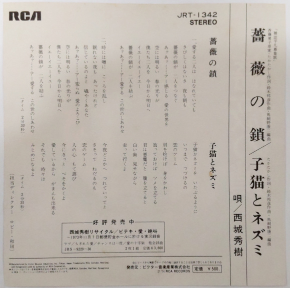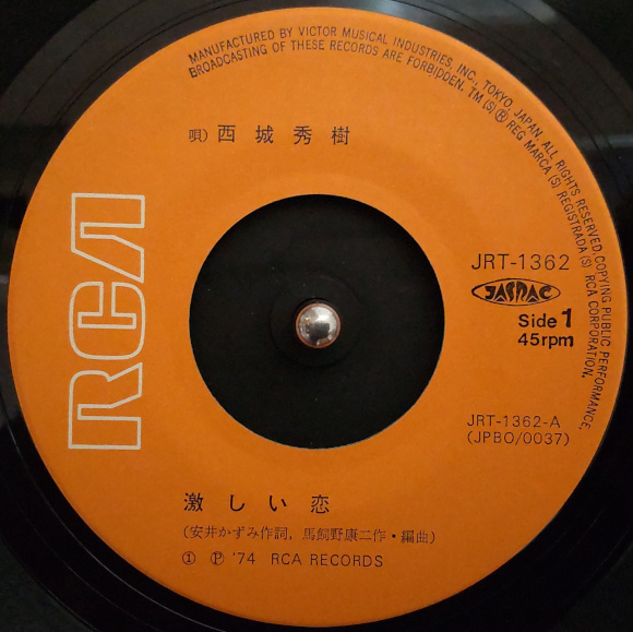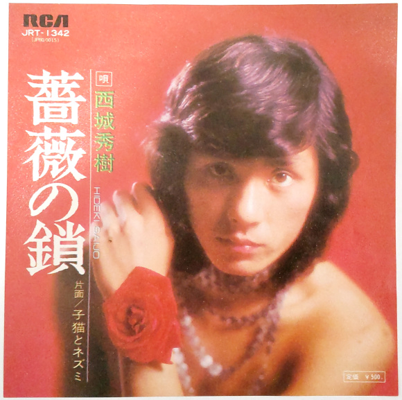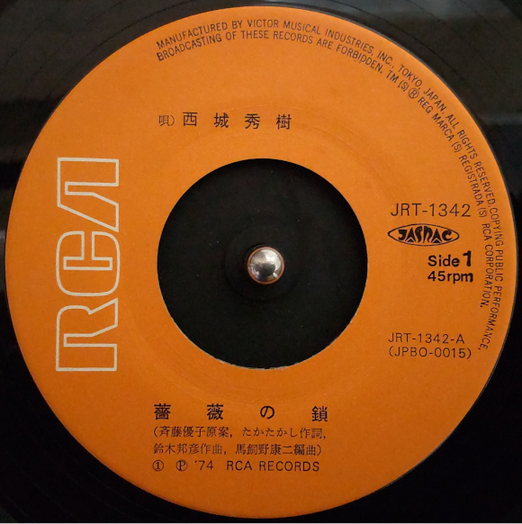 A面「薔薇の鎖」、子供の頃(?)によく聴きました。さすがの45回転ですね。かなり良い音質で保管されていた状態です。Aurex(東芝)のオーディオコンポが私の家にやってきたのは中学1年の時ですから、その頃からレコードをかけ始めたのかなと。今でもちゃんと歌える懐かしいヒデキのヒットソングです。 | |
