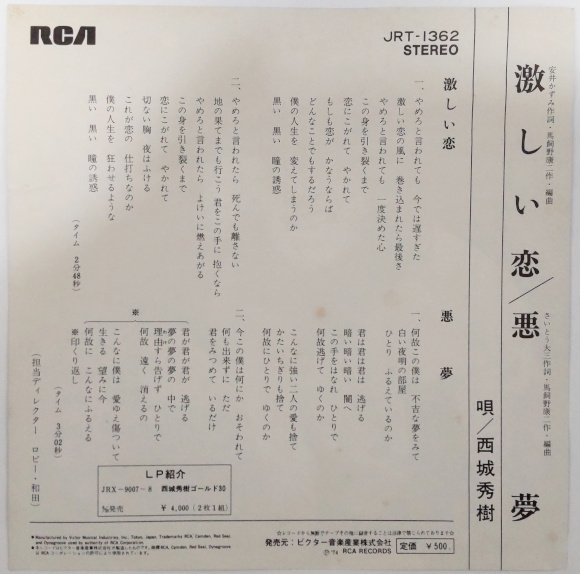 A面「激しい恋」、ヒューン、ヒューンのイントロ気持ちいい。やめろと言われても・・・・・、ヒデキ!と、思わずレスポンスしてしまう私がここにいます。ゆうわく〜〜〜。サビっていうか全部歌えます。懐かしい。シングル盤をあらためて聴いてアレンジの素晴らしさにも感動。今でもヒデキサウンドは不滅です。アナログレコード最高。 | |