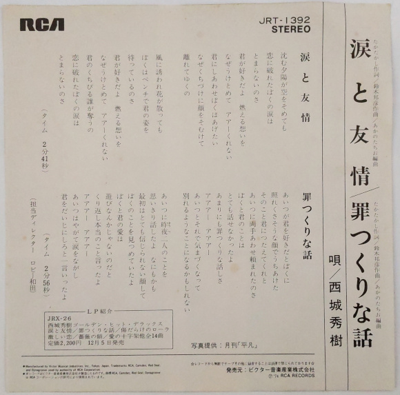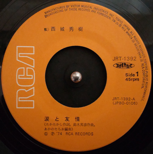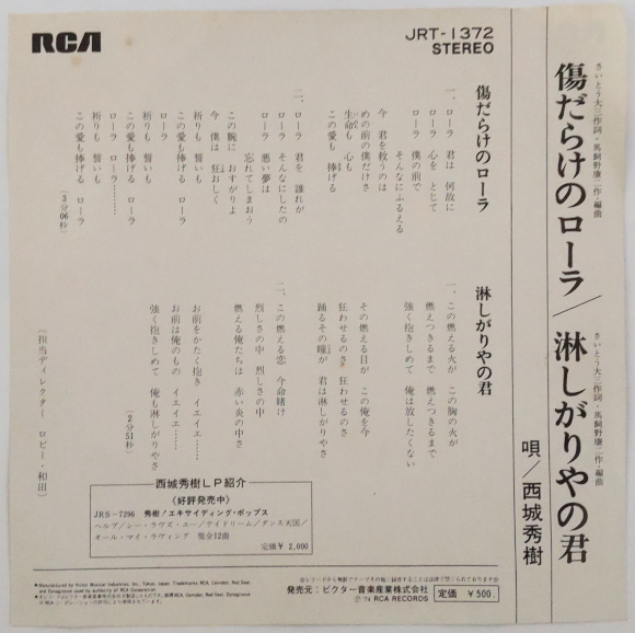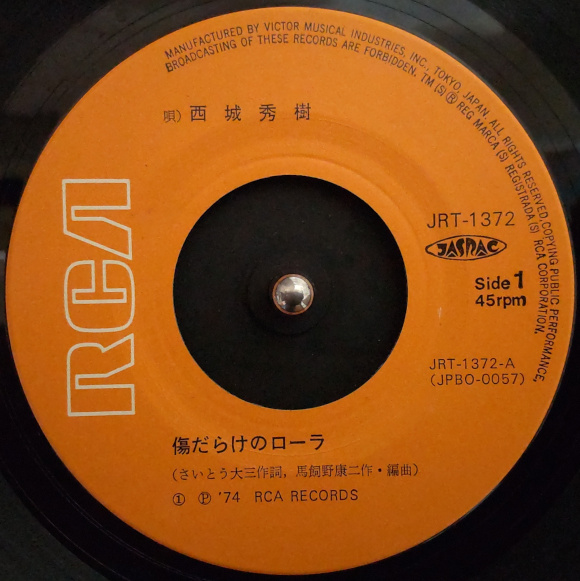 A面「傷だらけのローラ」、楽器の音圧が半端なく、凄い圧力、いいんですね。さすがのシングル音質。この曲も完全に歌えます。カラオケで熱唱(?)出来ます。ローラ・ローラ・ローラ、ヒデキは不滅です。馬飼野康二さんの作・編曲が最高ですね。当時のTV画面の映像がはっきりと頭に浮かんできます。アナログレコード万歳。 | |