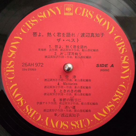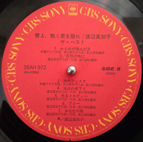 A面1曲目「唇よ、熱く君を語れ」、最近でも時々真知子さんをTVで見かけます。懐かしのソングとして本人登場ですね。この曲はCMソングでした。当時よく聴きました。いきなりのサビから入るところがいいですね。真知子さんのヒット曲のひとつです。A面7曲目「迷い道」、デビューシングルです。今思うとメロディもアレンジもよく出来ています。大ヒット曲ですね。既に懐かしのメロディですが、私達にとっては青春ソングでした。船山さんのアレンジも最高です。曲は時代を超えて不滅です。B面1曲目「かもめが飛んだ日」、セカンドシングルです。ヒット曲のひとつです。今聴いてもとても新鮮なサウンド。流れるような高揚感がいいです。船山さんのアレンジもノリノリじゃないですか。メロディを良く活かしている感じ。カラオケでまた歌いたくなりました。渡辺真知子さんのレコードを探すにあたって、ヒット曲が全て入っているということで、すぐに飛びつきました。リアルタイムには買えなかったけど、今こうして新鮮な気持ちで聴いています。アレンジャー船山基紀さんのベスト曲集でもあります。アナログレコードって時代を映す鏡ですね。 | |